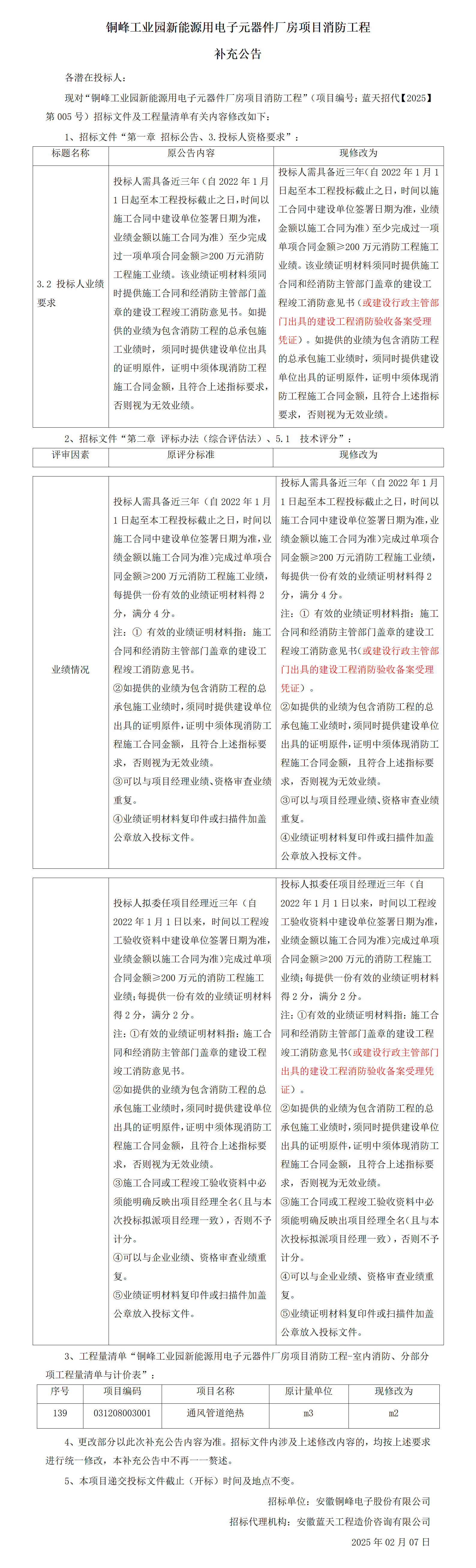 銅峰工業(yè)園新能源用電子元器件廠房項(xiàng)目消防工程補(bǔ)充公告