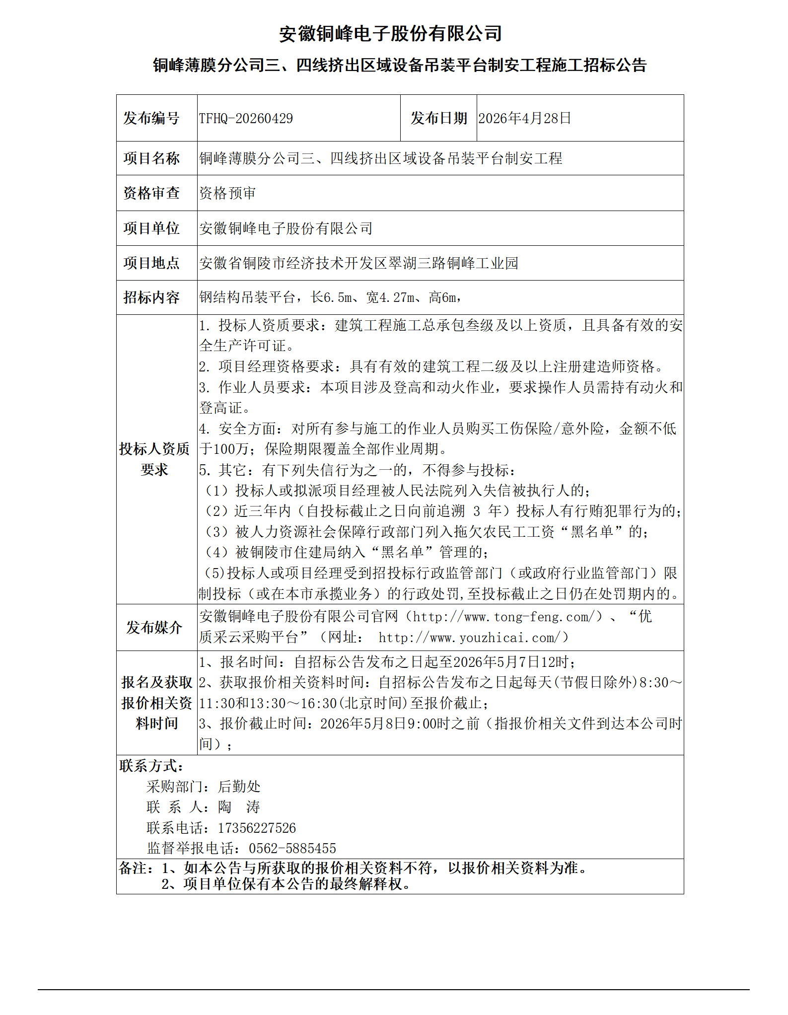 安徽銅峰電子股份有限公司 (薄膜分公司三、四線擠出區(qū)域設(shè)備吊裝平臺制安工程招標公告)_01