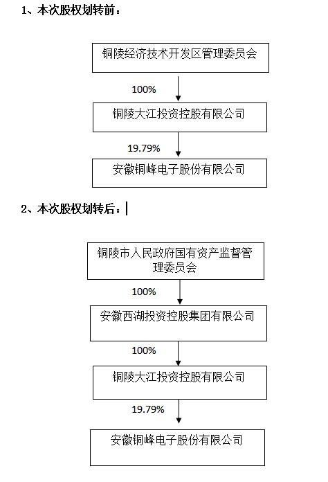 安徽銅峰電子股份有限公司(以下簡(jiǎn)稱“本公司”或“公司”)于 2022 年9月16日收到控股股東銅陵大江投資控股有限公司(以下簡(jiǎn)稱“大江投資”)的通知,為優(yōu)化國(guó)有資產(chǎn)配置,經(jīng)銅陵市人民政府批準(zhǔn),擬將公司實(shí)際控制人銅陵經(jīng)濟(jì)技術(shù)開發(fā)區(qū)管理委員會(huì)(以下簡(jiǎn)稱“銅陵經(jīng)開區(qū)管委會(huì)”)持有的控股股東大江投資100%股權(quán)劃轉(zhuǎn)至安徽西湖投資控股集團(tuán)有限公司(以下簡(jiǎn)稱“西湖投資”)。2022 年 9月16日,銅陵經(jīng)開區(qū)管委會(huì)與西湖投資已就本次國(guó)有股權(quán)劃轉(zhuǎn)事項(xiàng)簽署了《關(guān)于銅陵大江投資控股有限公司之股權(quán)無(wú)償劃轉(zhuǎn)協(xié)議》。上述股權(quán)劃轉(zhuǎn)事項(xiàng)尚需辦理工商變更手續(xù)。